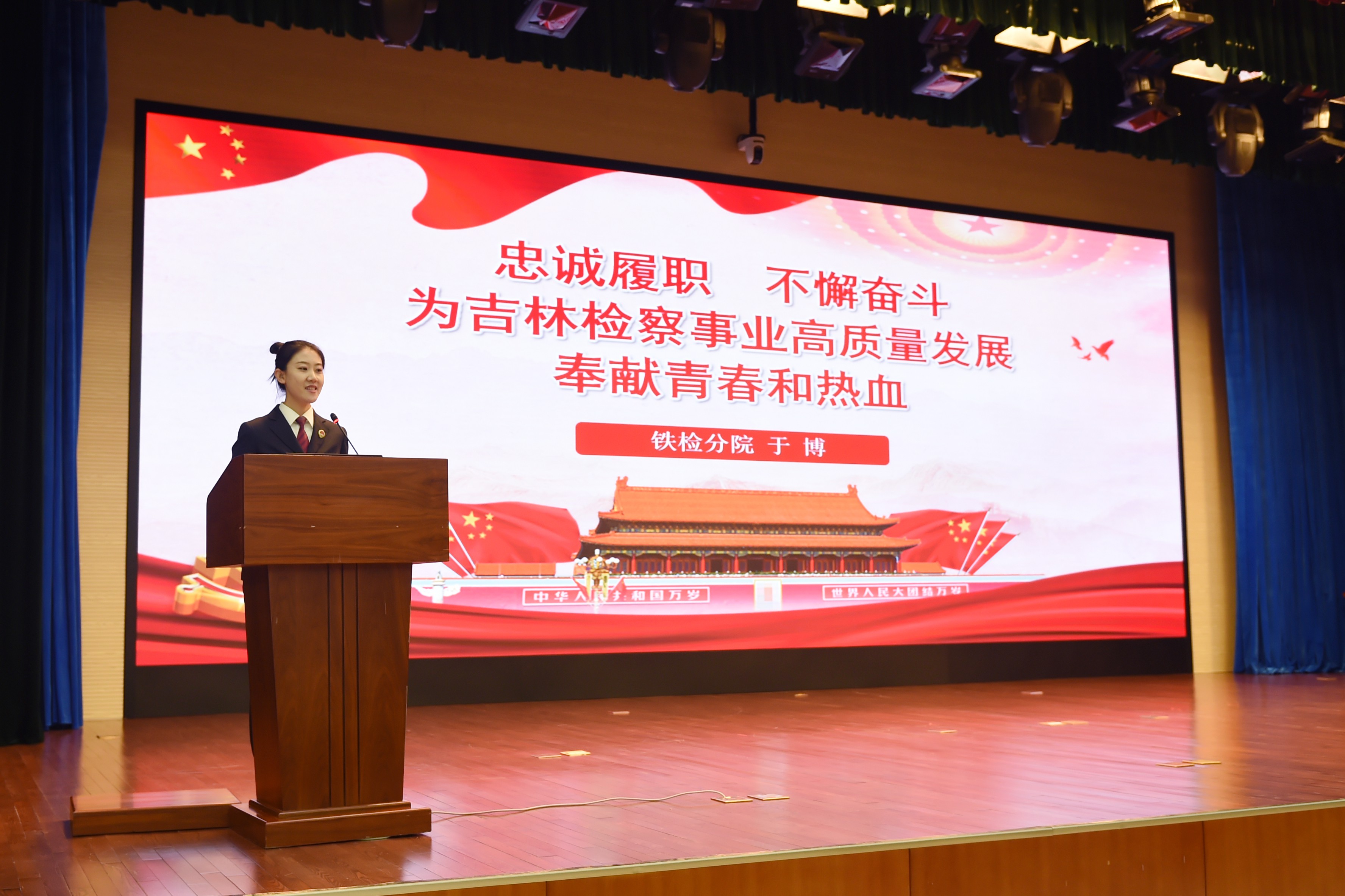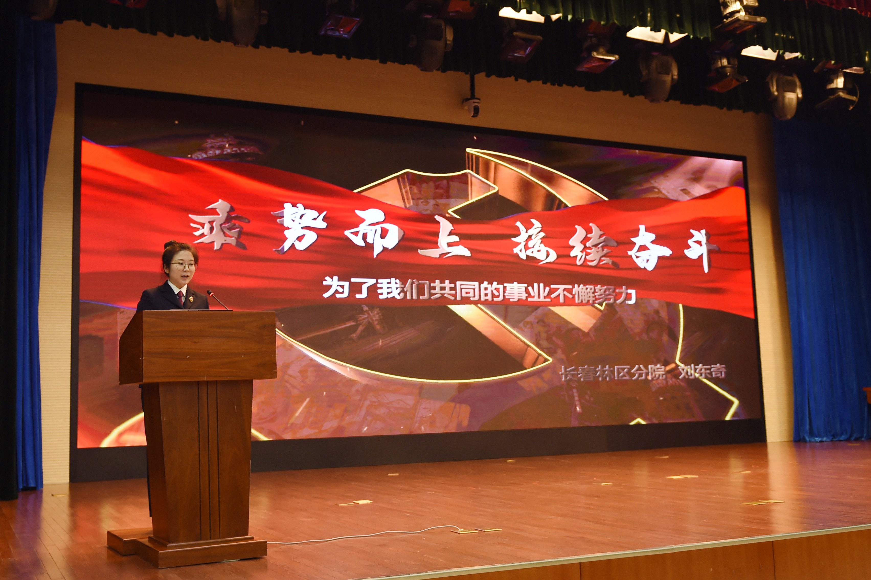 长春林区分院刘东奇以“乘势而上,继续奋斗,为了我们共同的事业不懈努力”为题,讲述一代又一代检察人,薪火相传、接续奋斗的感人故事。