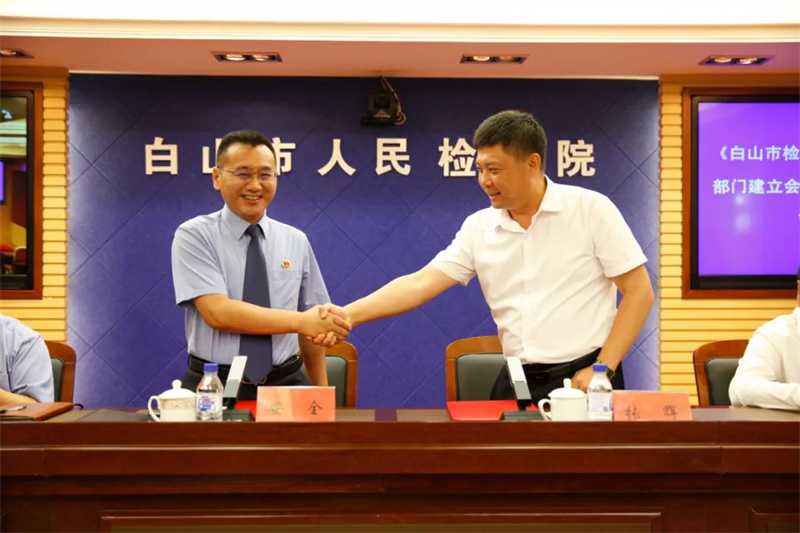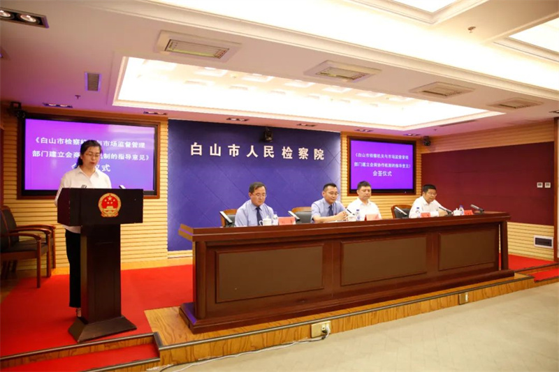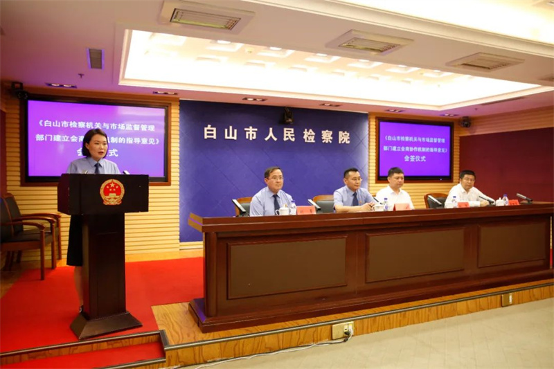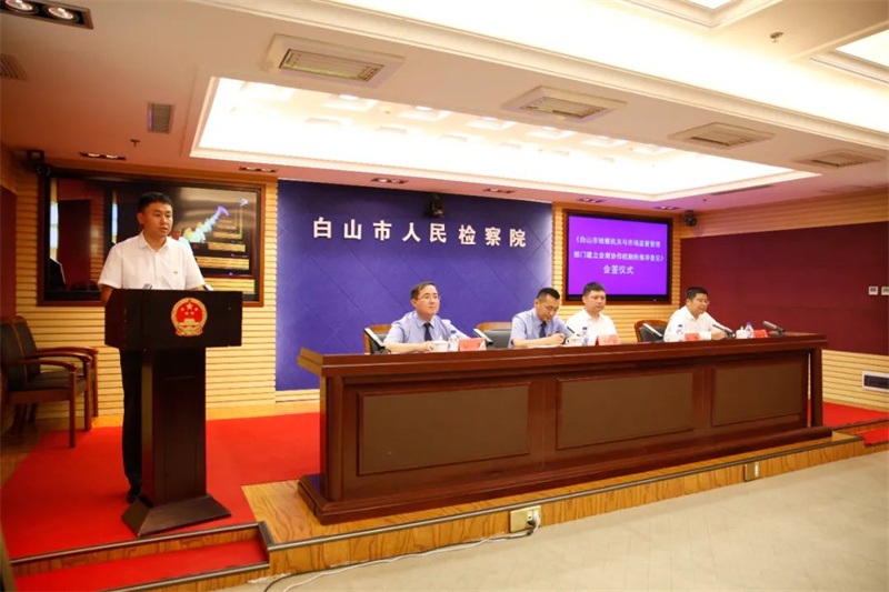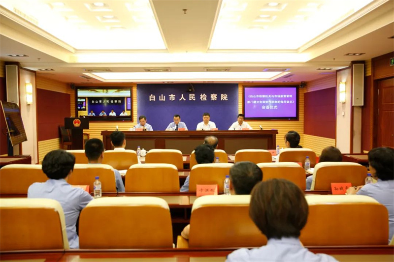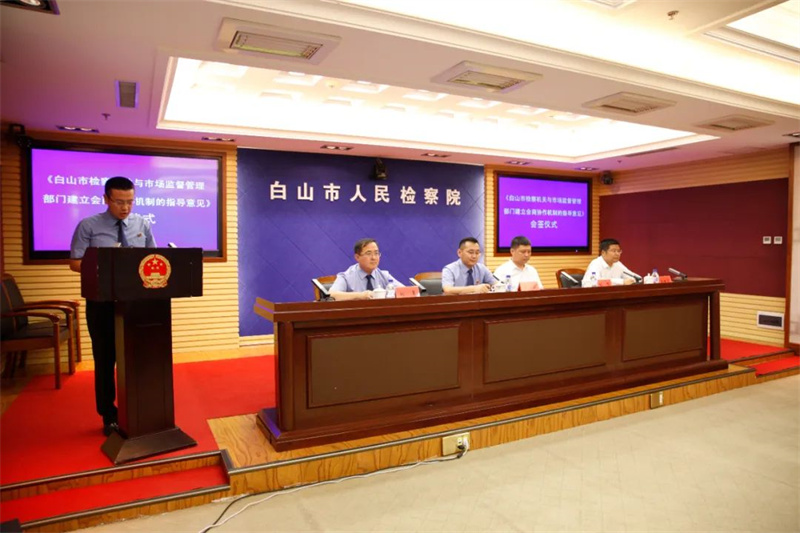 白山市检察院党组书记、检察长安全与白山市市场监督管理局党组书记、局长张辉共同签署了《白山市检察机关与市场监督管理部门建立会商协作机制的指导意见》。明确白山市检察机关与市场监督管理部门建立沟通联络、行刑衔接、公益诉讼协作、案件会商研判、信息共享、交流学习培训等常态化协作机制。