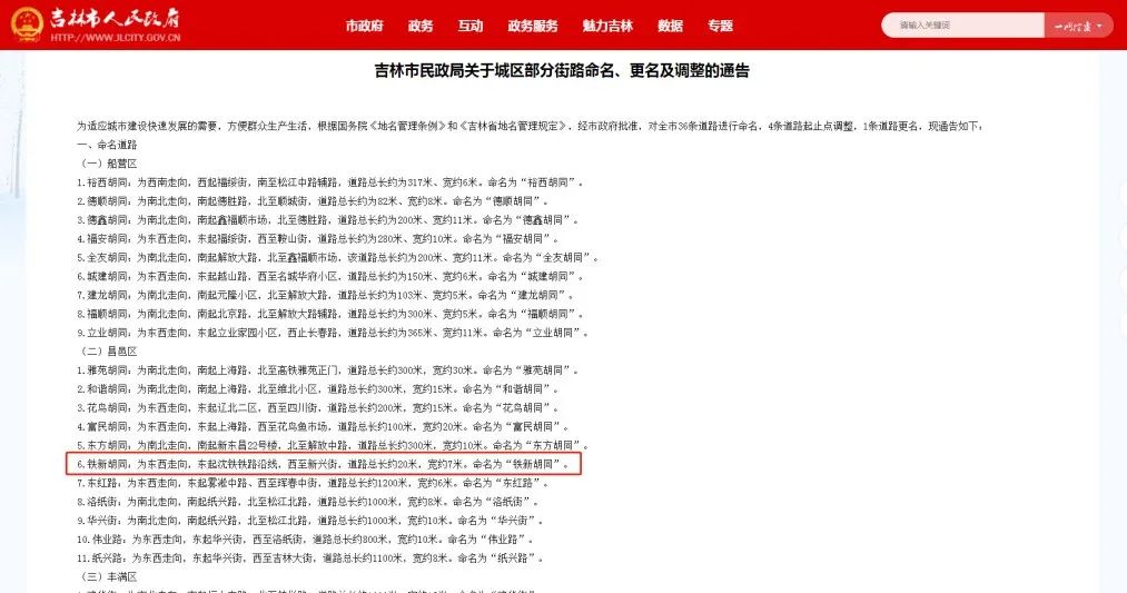 近日,吉林市人民政府官方网站上发布了《吉林市民政局关于城区部分街路命名、更名及调整的通告》,吉林市昌邑区一条东西走向,东起沈铁铁路沿线,西至新兴街,总长约20米,宽约7米的道路被正式命名为“铁新胡同”。