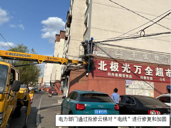 经多部门工作人员共同研究得出解决方案后,电力部门立刻派出抢修车辆到达现场,通过抢修云梯对“电线”进行捋直加固,并将“电线”高度固定在4米以上,满足消防救援车辆正常通行标准。