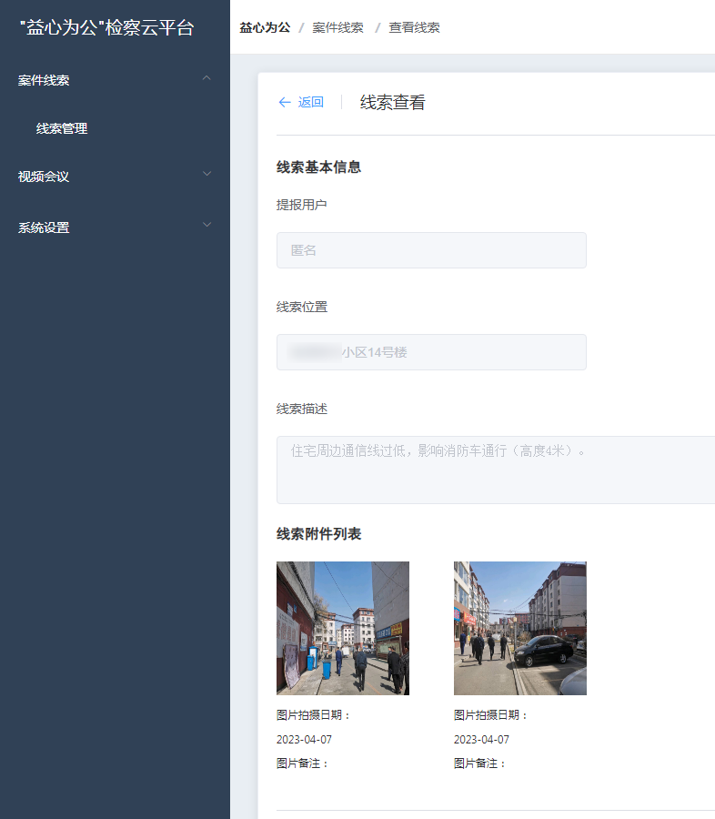 接到线索后,该院公益诉讼办案人员第一时间与属地街道、社区进行核实并到现场实地调查。经现场调查走访发现,该住宅小区没有物业,14号楼西侧一条电线横跨马路上空,其高度约3.5米,不满足消防救援车辆通行4米的安全高度标准,一旦发生火灾险情,势必会对消防救援车辆快速通行造成困难,人民群众生命财产安全将无法得到及时保障。