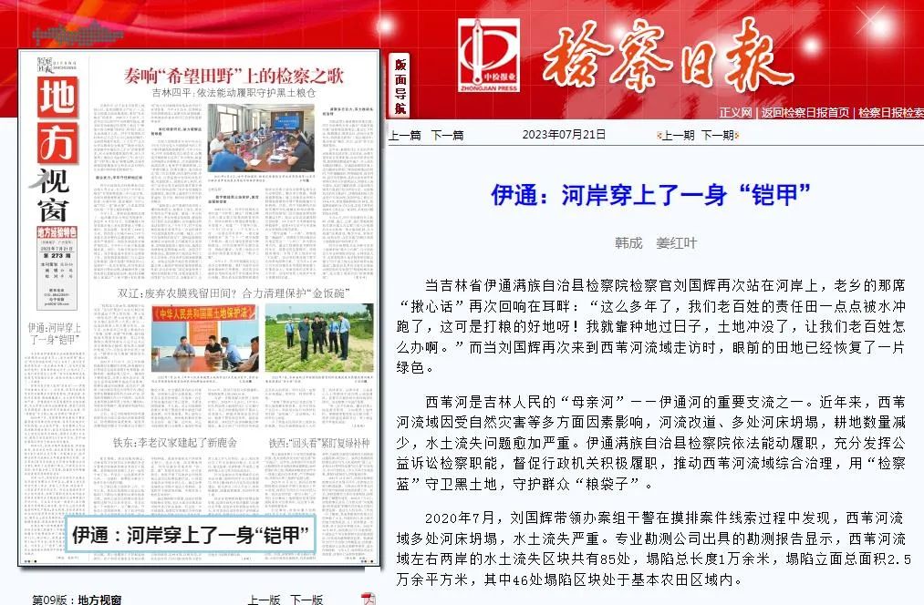 当吉林省伊通满族自治县检察院检察官刘国辉再次站在河岸上,老乡的那席“揪心话”再次回响在耳畔:“这么多年了,我们老百姓的责任田一点点被水冲跑了,这可是打粮的好地呀!我就靠种地过日子,土地冲没了,让我们老百姓怎么办啊。”而当刘国辉再次来到西苇河流域走访时,眼前的田地已经恢复了一片绿色。