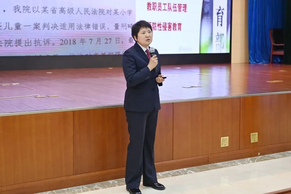 在检察开放日的观影和授课交流环节,老师们一同观看了检察微电影《追梦》,纷纷为片中检察官的坚守正义、履职尽责点赞。随后,乳交 第九检察部李颖检察官以《加强检校合作,护航未成年人健康成长》为题,为老师们详细讲授了检察机关在加强未成年人司法保护方面所做的各项工作,并结合近年来发生的案例,剖析了在保护未成年工作中应该注意的法律问题,与老师们进行了互动交流。