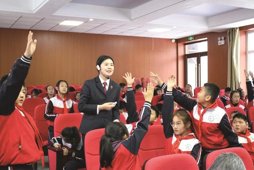 2023年11月29日,白山市浑江区检察院检察官(法治副校长)走进沿江小学开展普法宣传,并与孩子们互动。周鹏 摄