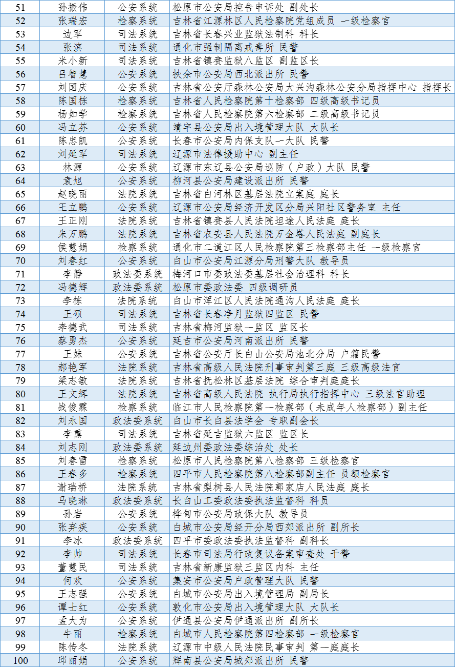 根据《全省“警爱民、民拥警”模范评选活动方案》安排,吉林省政法队伍教育整顿办公室组织开展了全省“警爱民、民拥警”模范评选活动。各地各单位积极参与、认真组织,推荐124名“警爱民”模范和124名“民拥警”模范。经网络投票和专家复评等环节,共评选出100名“警爱民”模范和100名“民拥警”模范。 现将入选模范名单予以公示,公示时间为5个工作日(2021年11月26日-12月2日)。如对公示结果有异议,请通过电话:0431-88792257反映。